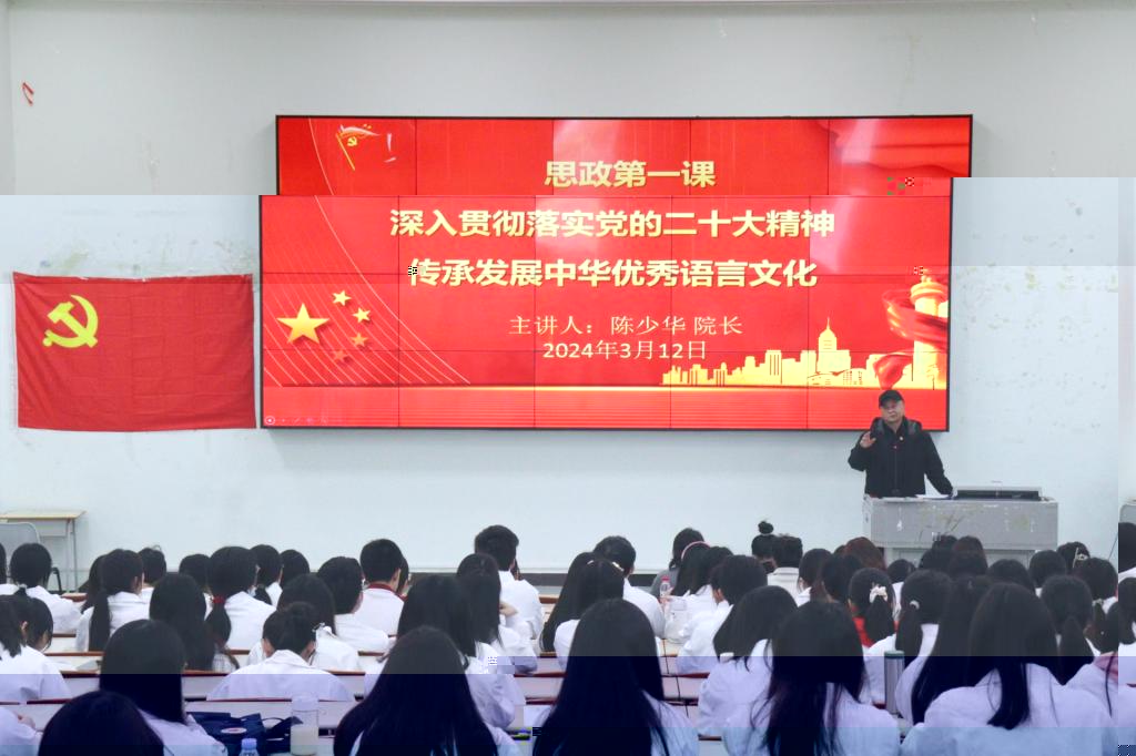 為深入學習貫徹習近平新時代中國特色社會主義思想和黨的二十大精神,構建“大思政”育人格局,3月12日,太阳集团城网址83138院長陳少華以深入貫徹落實黨的二十大精神,傳承發展中華優秀語言文化為主題、太阳集团城网址83138黨委副書記、副院長郭堪通以“推進文化自信自強、鑄就社會主義文化新輝煌”為主題題,為學院學生代表、專職輔導員講授開學思政第一課。