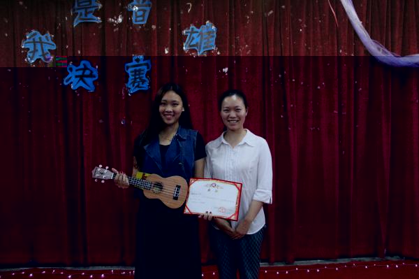 在選手演唱完畢後,女生部還貼心地為觀衆準備了“猜歌名赢禮品”遊戲。觀衆們都十分積極地參與到遊戲中來,一起感受音樂的樂趣。最後,比賽結果也出來了,獲得冠軍的是14漢文2班的謝欣欣,而13漢文2班郭廷和12新聞2班葉雷分别獲得亞季軍。宣布完冠亞軍後,便是最佳人氣獎的公布——由14漢文1班的陳鋈獲得,而最具台風獎則毫無懸念地落入了12漢文2班李灏恩的囊中。随着獎項的塵埃落定,本次“我是音雄”的比賽也落下了帷幕。