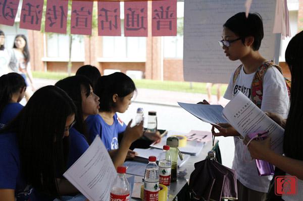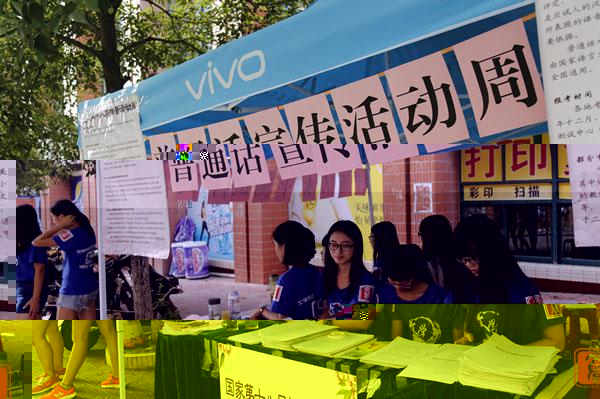 2015年9月15日下午兩點,我院為了響應國家第十八屆普通話推廣周,同時讓全院師生更多地了解《國家通用語言文字法》和《普通話水平測試》的相關知識,在雅悅超市旁設立了擺攤咨詢點,以方便各位師生到場進行咨詢。本次活動受到了學院領導的重視,教務處源國偉處長、郭慶潮老師、華商太阳集团城网址83138文學系尹康莊主任、文學系團總支學生分會唐志壕書記莅臨現場指導。