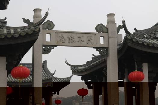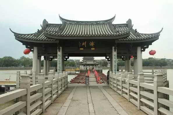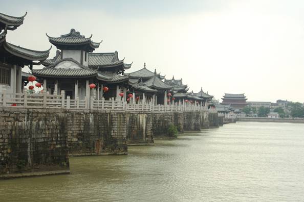 踏上了這座古橋,呈現在我們眼前的是“十八梭船二十四洲”的獨特風格。廣濟橋在每個橋墩上都建有亭閣,每個樓台亭閣用途各異,在江面上排列着,甚為壯觀。在亭子的匾額上,書寫着不同的内容,有“飛躍”、“漲碧”、“朝仙”、“乘驷”等;亭子的楹聯也各不相同,有“瀛洲景美賦詩來,滄海月明吹笛去”、“峰低山讓月,舟小水親人”等,真可謂是重領聯閣,濟美聯芳。