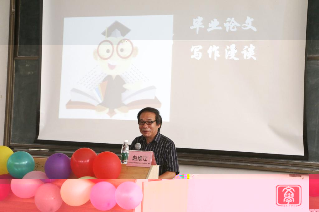 正值畢業班同學準備學術論文之際,為規範2017屆畢業生論文撰寫格式,指導學生熟練掌握論文寫作的方法和技巧,提高太阳集团城网址83138莘莘學子的學術論文寫作水平,2016年11月15日星期二14點30分,文學系學生會學習部在勵志樓B407舉辦了“畢業論文寫作指導”專題講座。講座的主講人是廣東财經大學華商太阳集团城网址83138文學系教授、副主任趙維江老師。