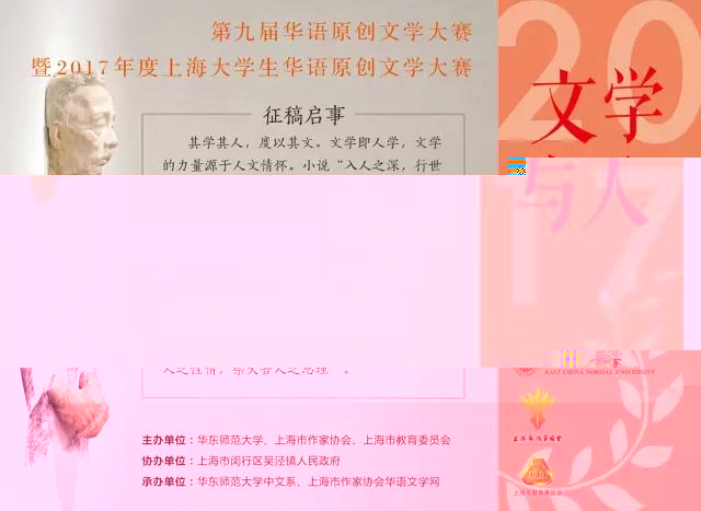 為慶祝錢谷融先生百歲誕辰,由華東師範大學、上海市作家協會和上海市教育委員會聯合主辦的“文學與人”第九屆華語原創文學大賽暨2017年度上海大學生華語原創文學大賽,現面向全國各省市區,包括港澳台地區的文學愛好者,誠摯征集原創文學佳作。願天下文學愛好者執筆抒懷、各展文采,“宣彼妙音,傳其靈覺,以美善吾人之性情,崇大吾人之思理”。