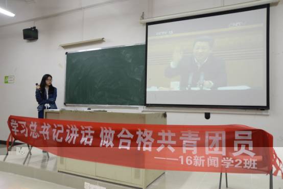 而16級新聞學2班,則是通過在教室内播放有關習總書記講話視頻、幻燈片的形式,直接明了地讓同學們從團支書所提供的資料中學習總書記講話的精髓。資料内容不僅有關于國家的方針政策,而且包含了習總書記對于新一代青年的要求和建議。同學們除了學習總書記講話精神外,也明白了青年要始終堅持深學細照笃行,樹立做人做事的标杆。
