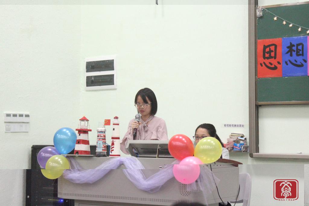 接下來是班級展示環節。首先,16級漢語言文學3班的代表上台展示他們制作的燈塔,并為我們普及“燈塔計劃”的内容,闡述他們的制作理念,希望各位同學能如燈塔的寓意一樣:凝聚力量,砥砺前行,不忘初心,照亮他人。