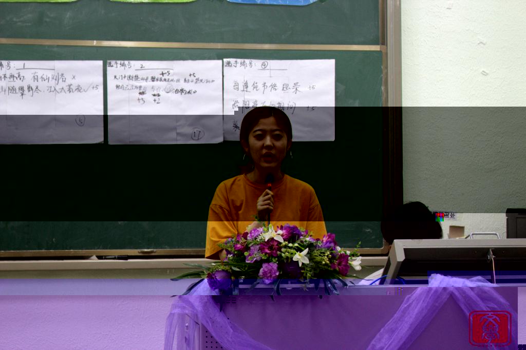 經過激烈的初賽和複賽兩輪篩選,2018年5月10日19時,第二屆“墨痕書香”國學知識競賽決賽在勵志樓D208正式進行。本次到場的嘉賓有漢語國際教育教研室老師蘇延烨老師、文學系團總支副書記方钰霖、文學系學生會主席許佳楠、文學系學生會副主席李國欣、文學系學生會副主席鄭小曼、文學系學生會副主席張夢圓、文學系學生會秘長劉嘉宜以及各系嘉賓代表。