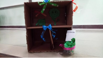 設計理念:模拟小書櫃,貼上綠色的、微笑着的向陽花,結構簡單分明,彩帶裝飾内外檐,真是“櫃”上添花;外加綠色小盆栽,蔓延綠色氣息。
