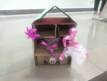 設計理念:溫馨小房子,裡面用紙闆隔開,可以放一些小東西;房子第一層是一個小抽屜,可拉動;加上一個簡單的小筆筒,以及彩帶的裝飾,小房子美妙絕倫。