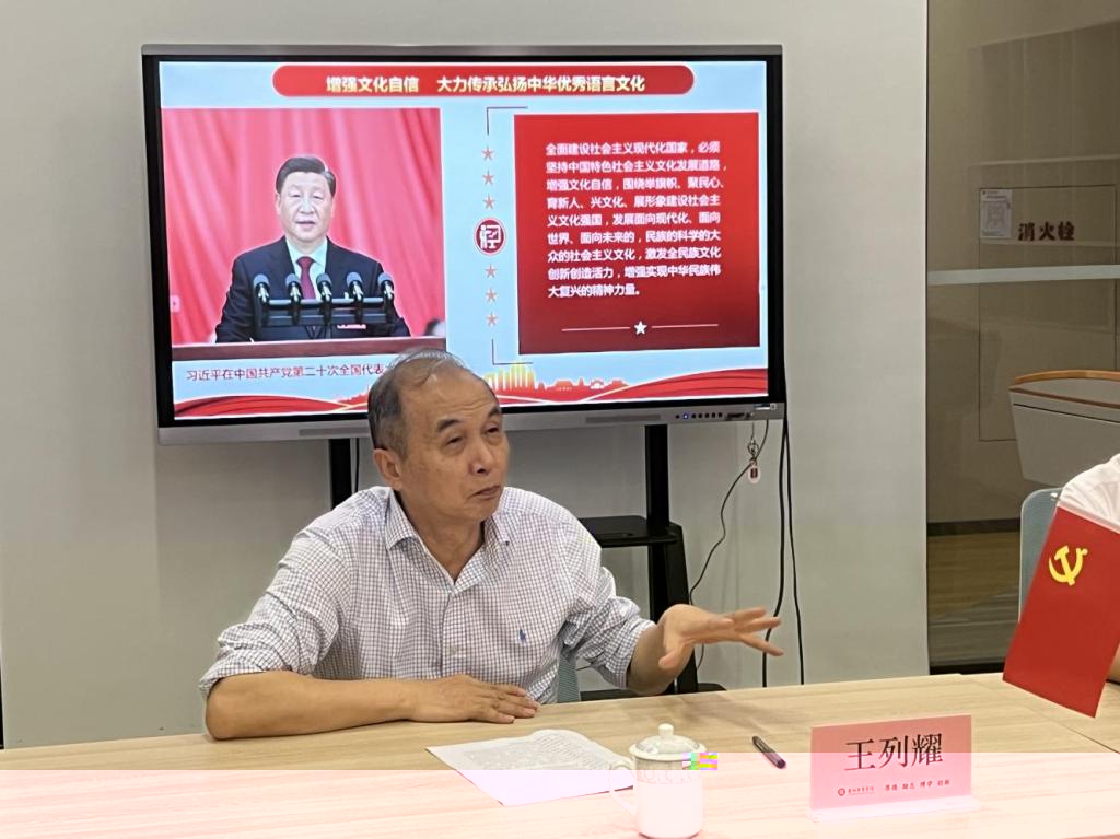 王列耀副校長結合黨課内容強調:各位黨員要深入學習貫徹黨的二十大精神,深刻領悟“兩個确立”的決定性意義,增強“四個意識”、堅定“四個自信”、做到“兩個維護”,立足語言文字是國家重要的文化資源、經濟資源、安全資源、戰略資源這一戰略定位,深刻認識語言文字事業基礎性、全局性、社會性、全民性的内涵特征,加大國家通用語言文字推廣力度,傳承弘揚中華優秀語言文化,以語言文字事業高質量發展全面服務支撐中國式現代化,為全面建設社會主義現代化國家、全面推進中華民族偉大複興貢獻力量。
