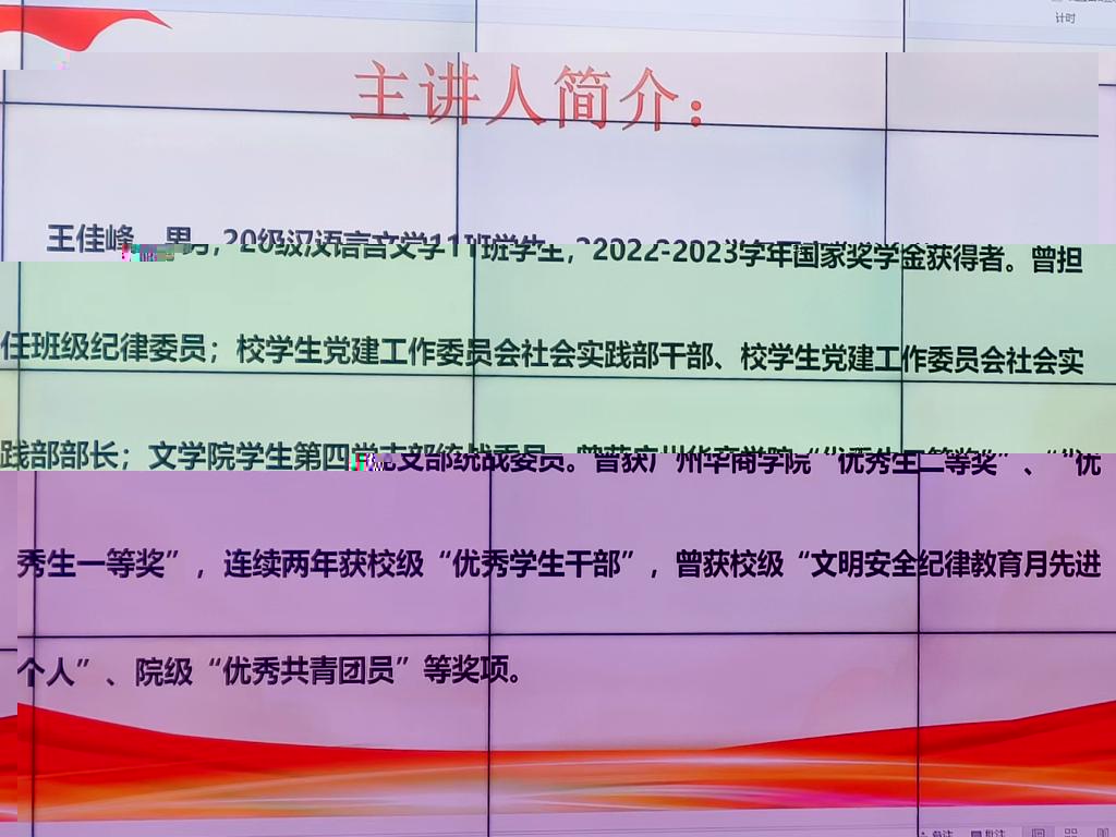 緊接着是關于兩位主講人的簡介,王佳峰師兄和任靜師姐分别是國家獎學金和國家勵志獎學金的獲得者,他們借此契機将豐富的經驗成果傳授給我們,希望對我們今後的學習有一定幫助。